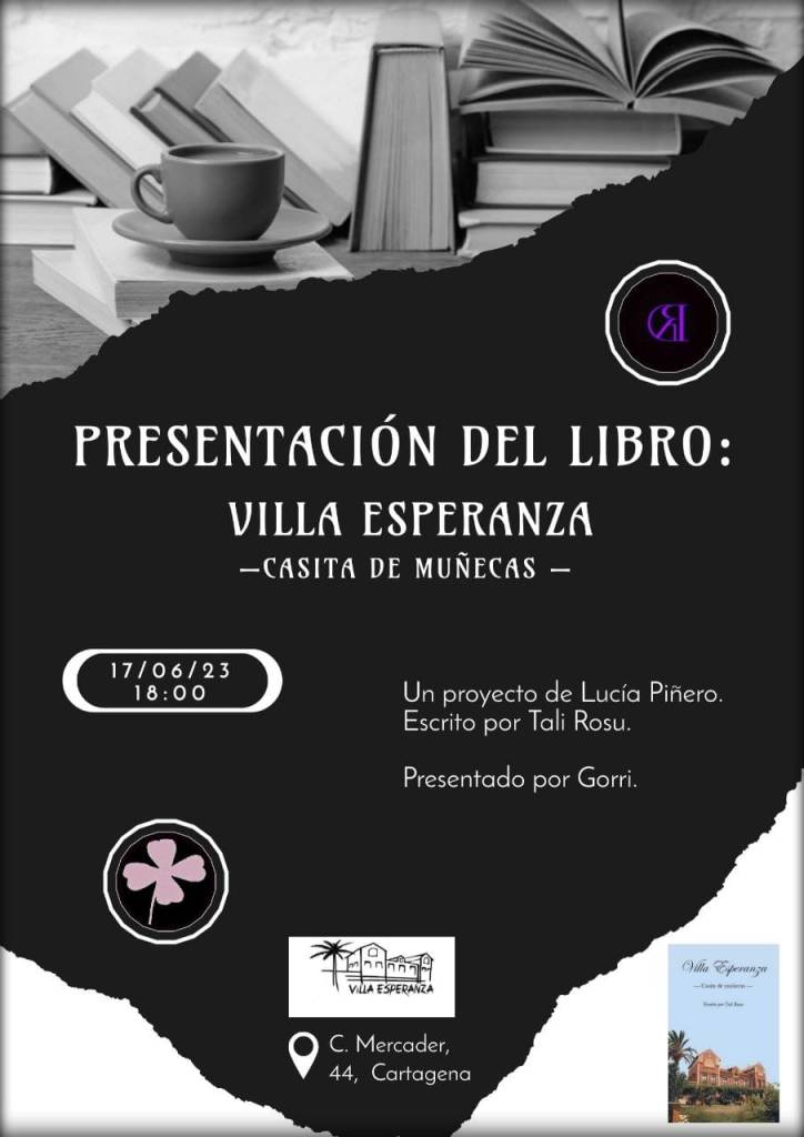 Mañana sábado 17 de junio a las 18:00 horas se presentará en Villa Esperanza, un edificio histórico modernista del Barrio de Peral de Cartagena, el libro Villa Esperanza, casita de muñecas, editado por la editorial Cuatro Hojas. Se trata de un proyecto de Lucía Piñero escrito por Tali Rosu. En este proyecto se ha plasmado la historia del padre de Lucía, Pepe Piñero, y de cómo recuperó una casa que estaba en ruinas. El libro está narrado usando un tono poético y el estilo de redacción característico de Tali, además, cuenta con la colaboración de María Dolores Vieites y de Antonio Vidal, Gorri, dos poetas que han aportado un poema cada uno.