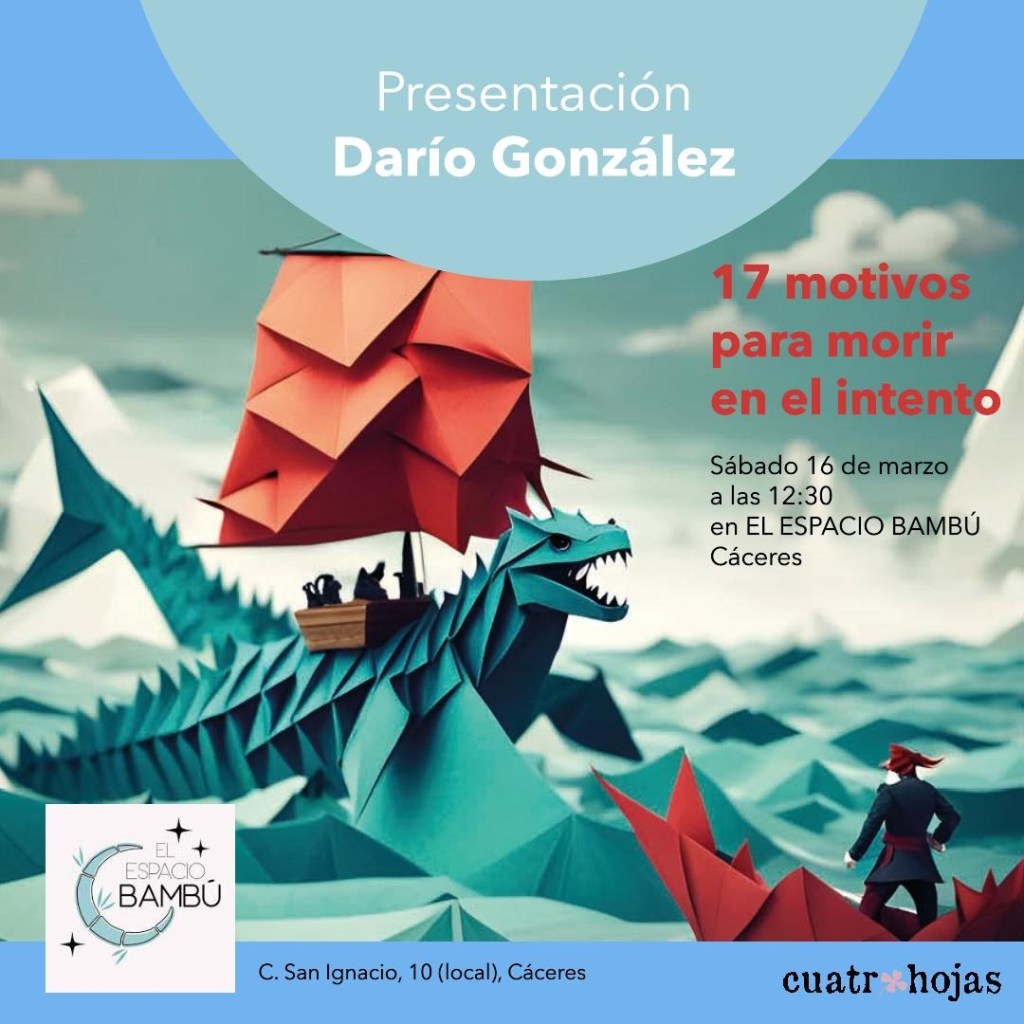 Darío ha seleccionado cuidadosamente algunos de sus poemas y los ha plasmado en papel. Descubre a este autor en la presentación de «17 motivos para morir en el intento», un libro editado por la Editorial Cuatro Hojas.