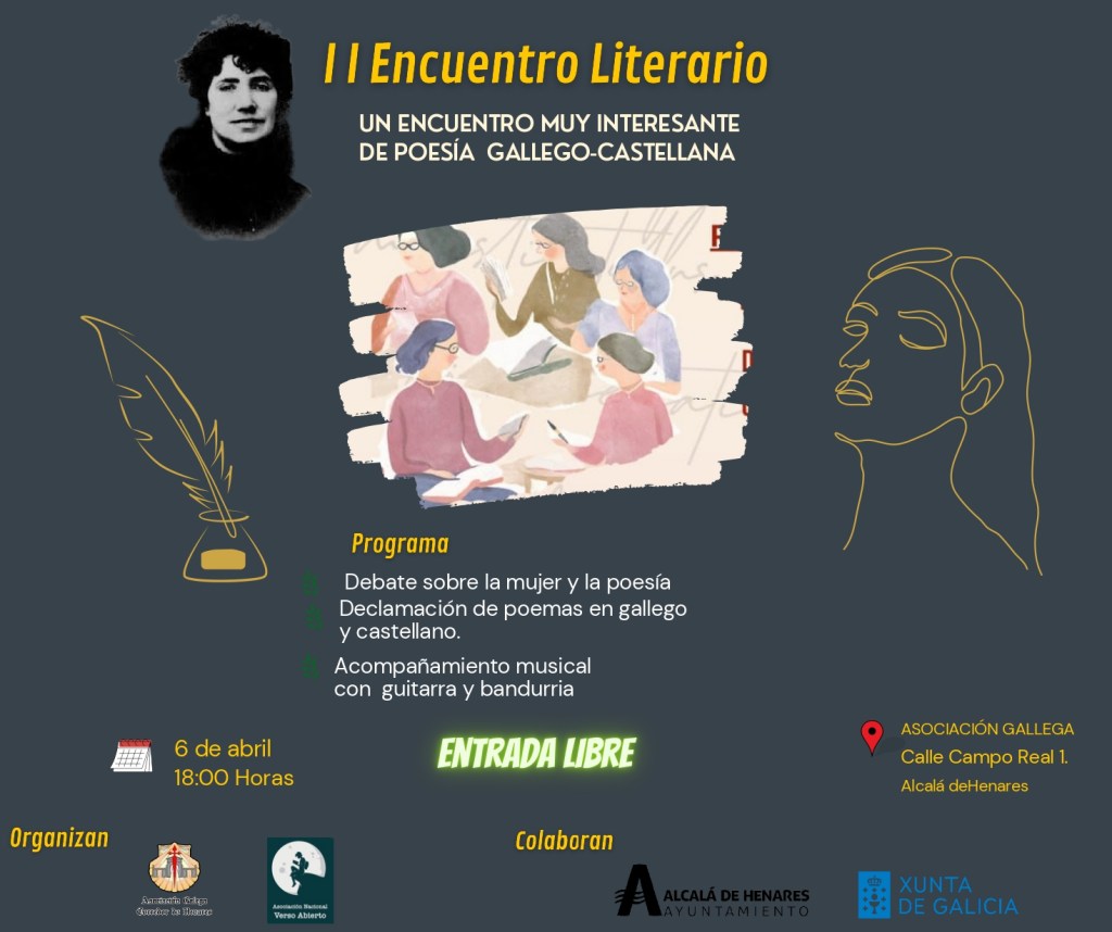 El sábado 6 de abril, a partir de las 18:00 h, se realizará el II Encuentro Literario Gallego-Castellano. El acto tendrá lugar en la sede de la entidad gallega en la localidad complutense de Alcalá de Henares, en Madrid.